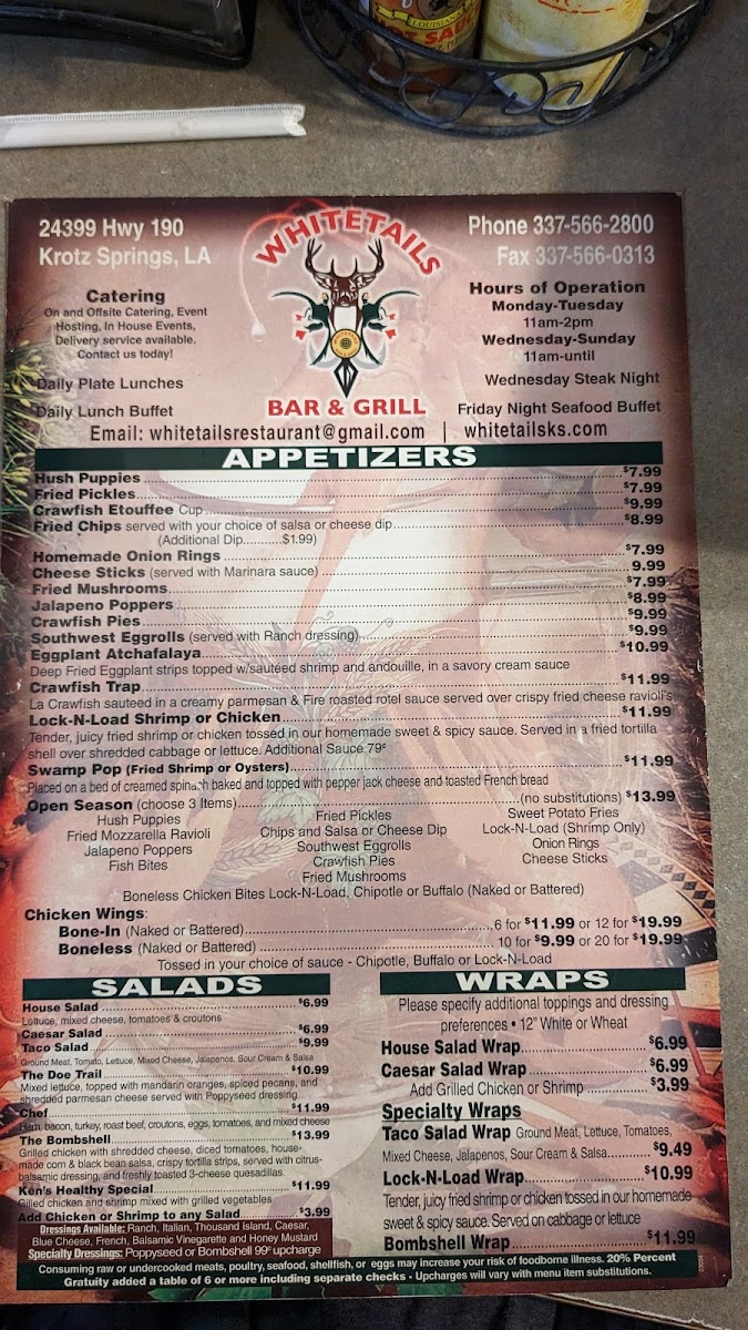 Welcome to White Tails Sports Bar And Grill, a hidden gem located at 24399 US-190 in Krotz Springs, LA. This inviting eatery offers a menu bursting with flavor and creativity, perfect for both families and road-trippers alike.